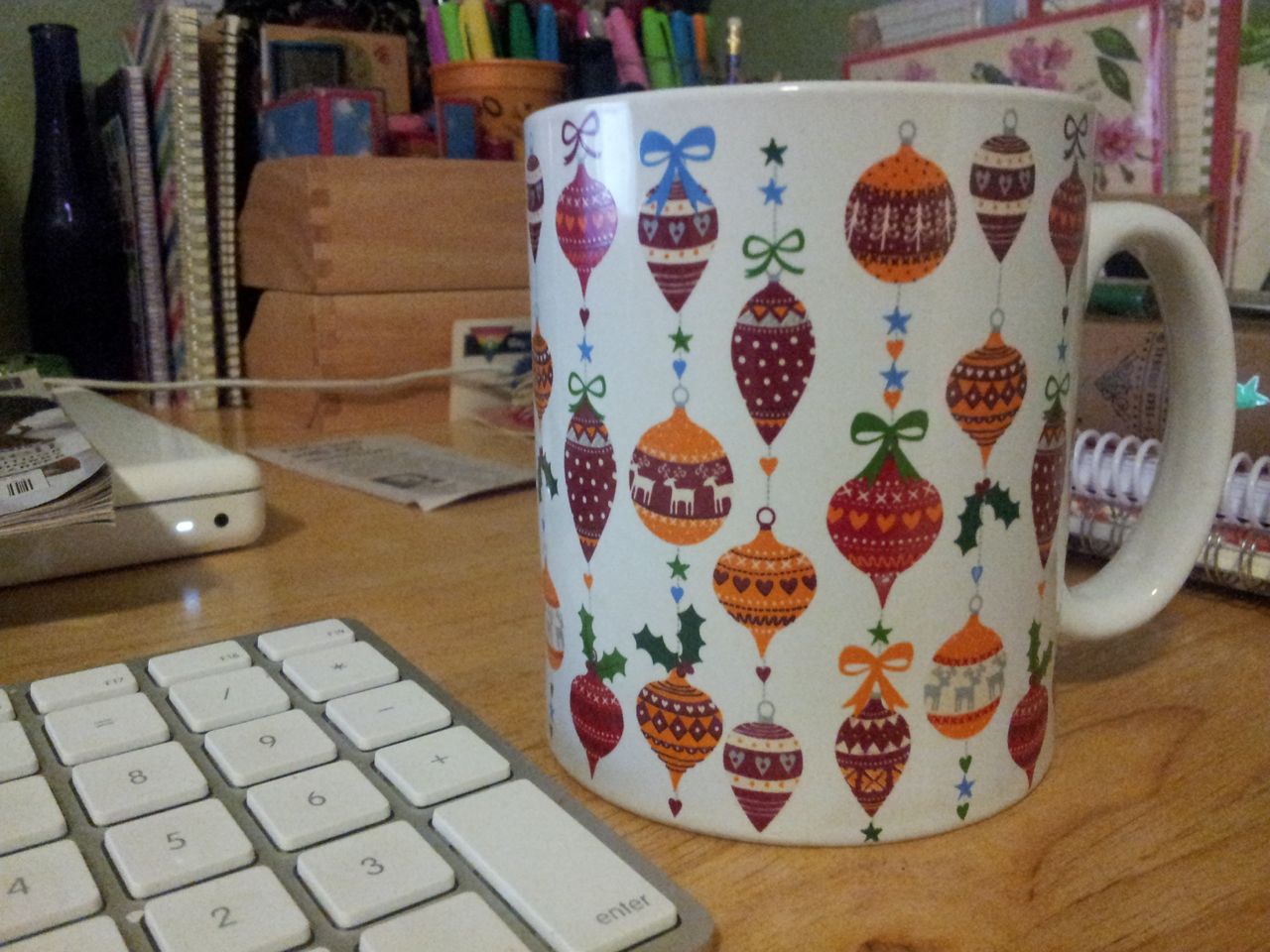 Right now, it’s 11:45pm on December 30th. I’m drinking a cup of decaf coffee out of my new Christmas mug and listening to Johnny Cash’s cover of “Hurt” while I type this blog post at my desk. My blinds are open despite the late hour and I can see the colored lights on the bushes outside, swaying slightly in the cold wind. My cat is taking a bath on the bed behind me and I know that any minute now he’s going to jump in my lap and try to edit what I’m writing. I just heard my husband sneeze. This is my present moment. No matter what I accomplished this year, no matter what might happen when I change the calendar to January, right now I’m at home and I’m writing and I’m happy.