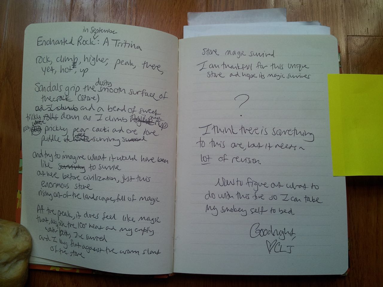 I just picked up an old journal from January of 2011 and found the first, very rough, draft of my poem “Enchanted Rock in September” which was published in the 2012 Texas Poetry Calendar.