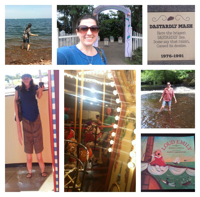 Photos: Skipping a rock at Lake Ontario in Pultneyville, NY; The Flavor Graveyard at the Ben & Jerry’s Factory in Waterbury, VT; The Carousel Museum in Hartford, CT; a creek somewhere in Rhode Island; Loud Emily by Alexis O’Neill, illustrated by Nancy Carpenter