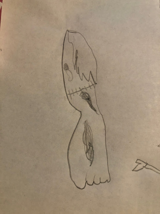 A friend of mine read some the stories to her six-year-old daughter, and now she’s writing a scary story of her own! It’s called “The Bodiless Foot,” and it comes with some wicked illustrations.