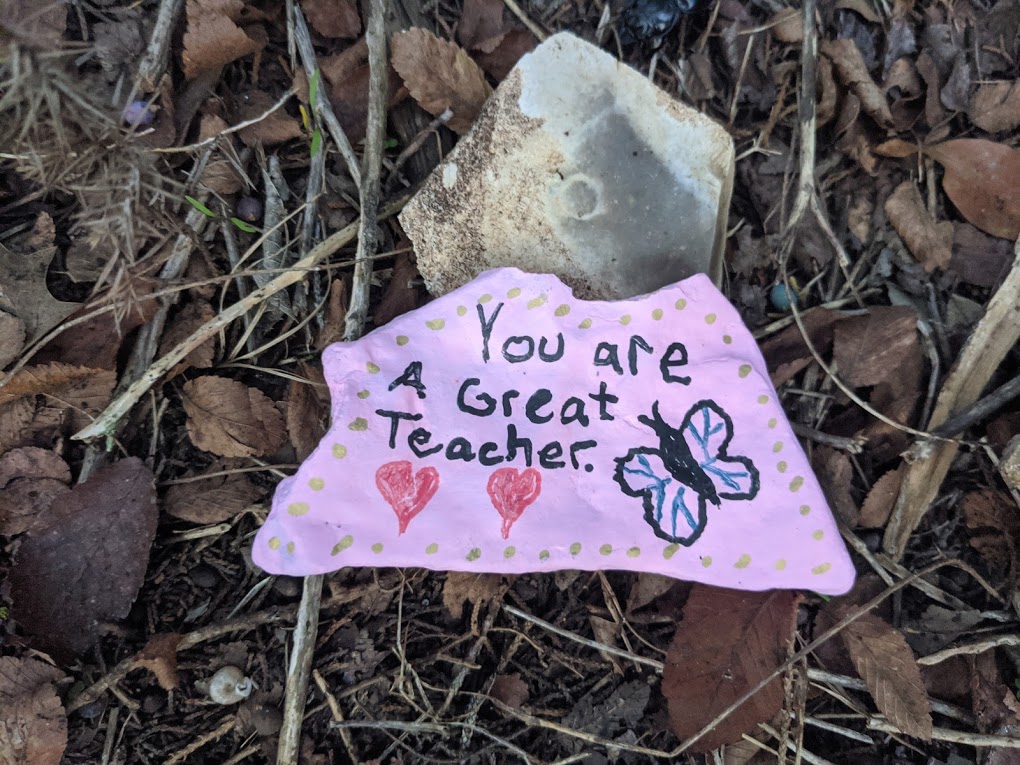 But we did it, and we’re still doing it, and we’ll keep doing it to the best of our ability. I’m very proud of my campus and my coworkers and my community. This morning, while walking the trail in my neighborhood, I saw this painted rock, and it felt like such a gift. I’m sending it out to all my fellow teachers.
