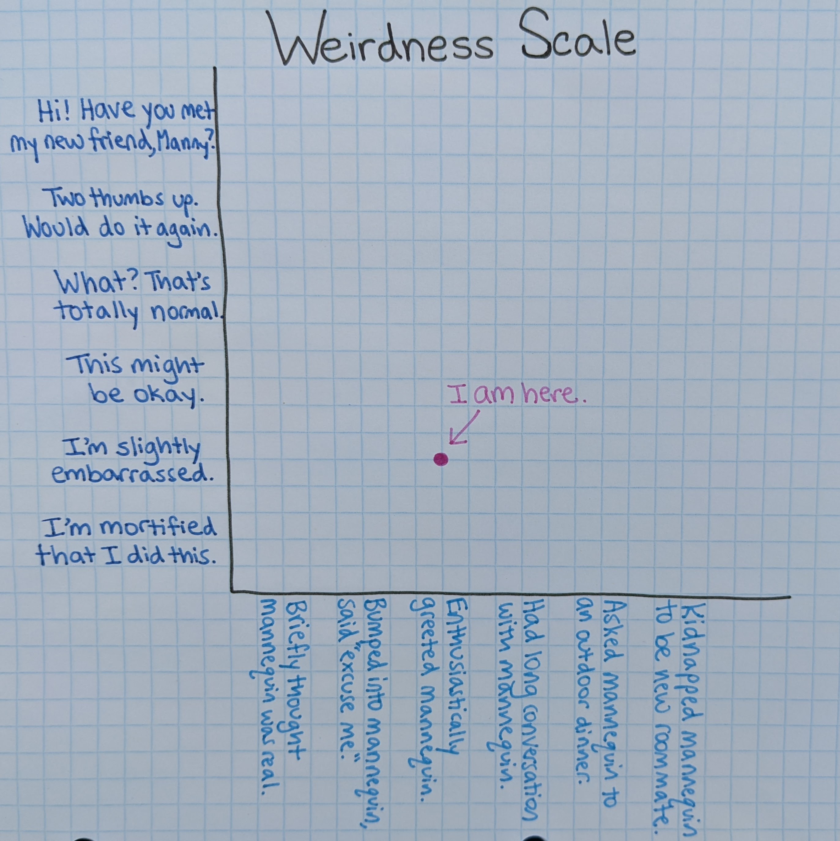 This wasn’t one of those situations where you accidentally bump into a mannequin and instinctively say “Excuse me” before realizing it wasn’t a real person. No, I was a good fifteen feet from this mannequin when I glanced up and said, “Hi!” and smiled behind my double layer of masks. Looking back now, I’m not even sure it had a head. I just saw a human-shaped torso in a cute cardigan out of the corner of my eye and enthusiastically greeted it. This is when I realized I need to get out more.