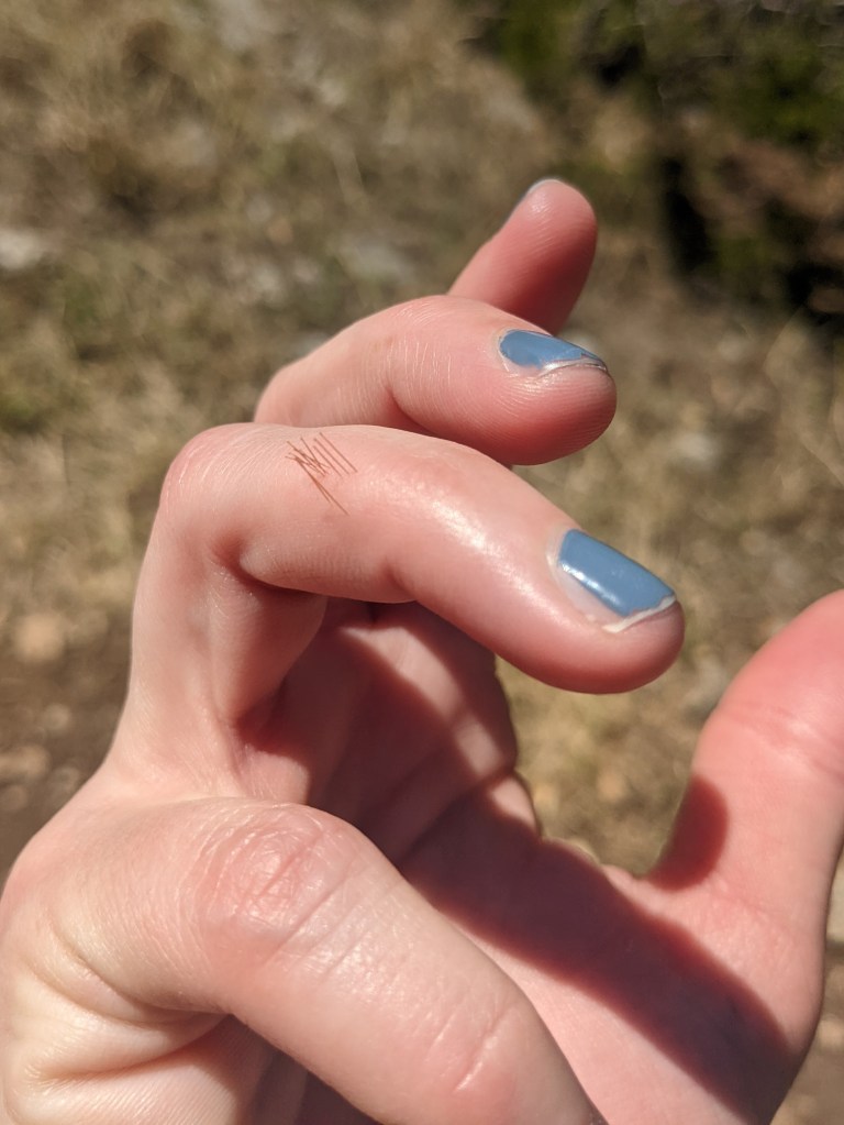 Today, I decided to celebrate the warm spring weather by going on a hike. Along the trail, I spotted these beautiful blooms and wanted to take pictures of them. Little did I know, I was falling right into their trap. When I knelt down to snap a photo of these pretty pink flowers, the dying cactus next to them stabbed me. Either that, or I was attacked by the world’s tiniest porcupine. Either way, I stood up with a finger full of thorns that I had to pluck out. Ouch! Beware of beauty. It bites.