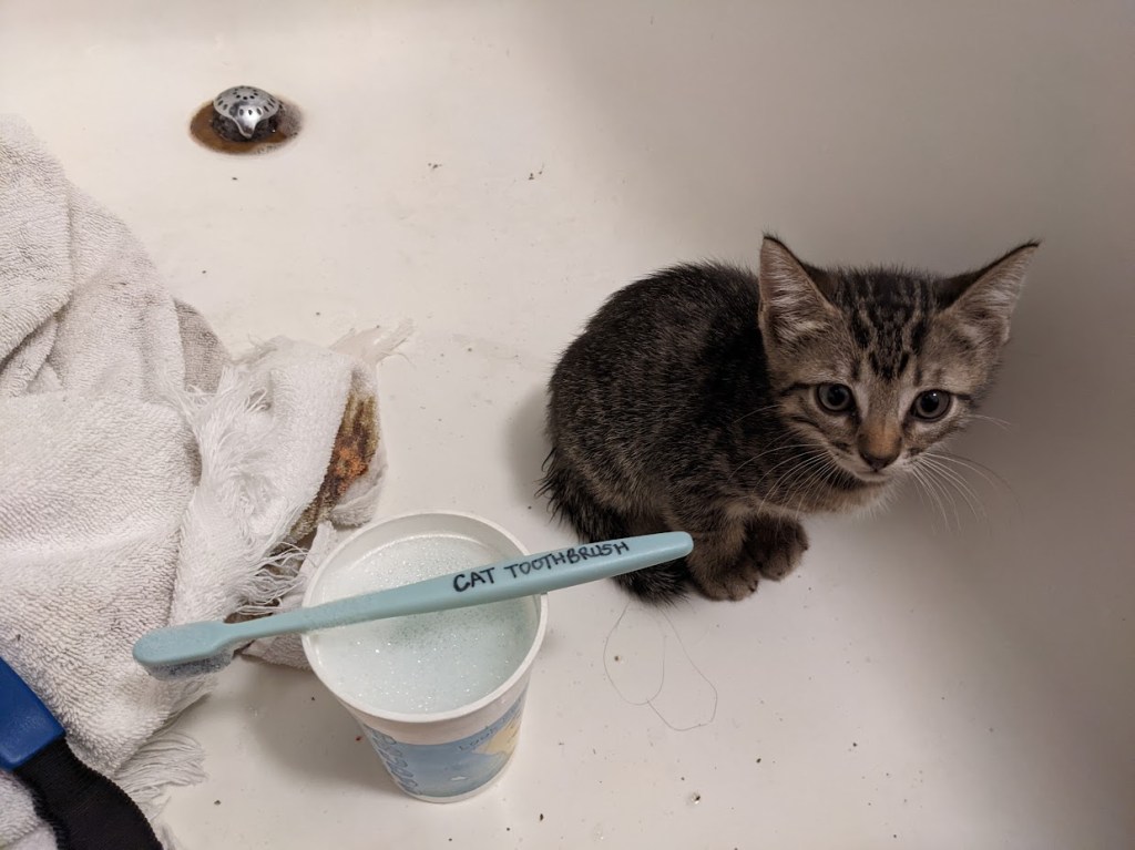 - Labels are important. Toothbrushes are excellent tools for kitten care. They’re useful for bathing, especially when you’re soaping up their tiny necks to keep the fleas from running to their head, and they’re good for gently stroking their widdle faces to remind them of their mama. But when you decide to take your own old toothbrush and use it on cats, you need to label it for that moment when you are severely sleep deprived and need to brush your teeth.