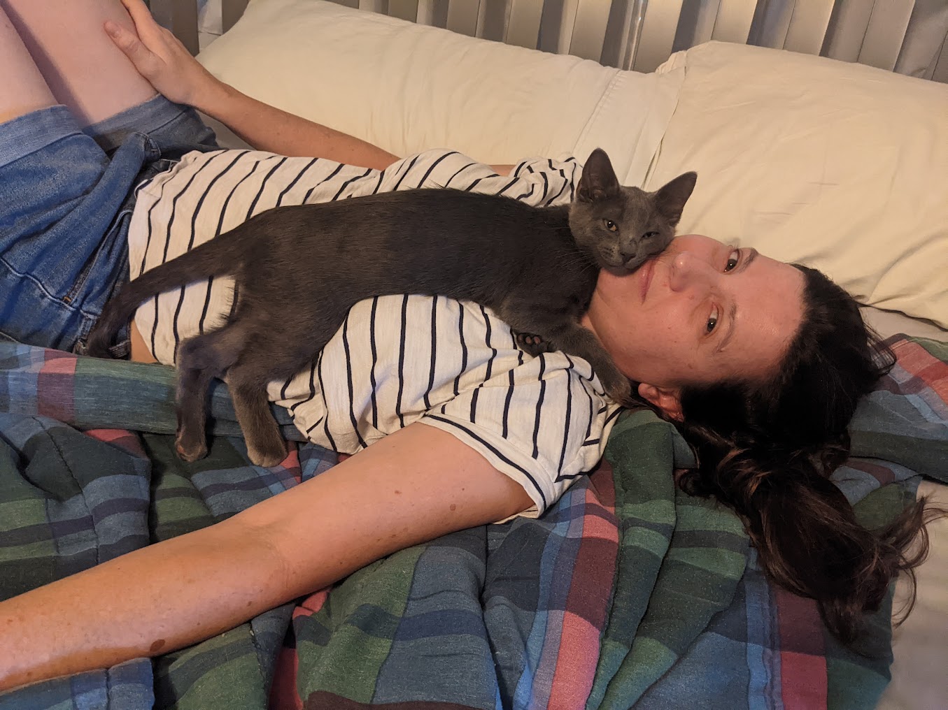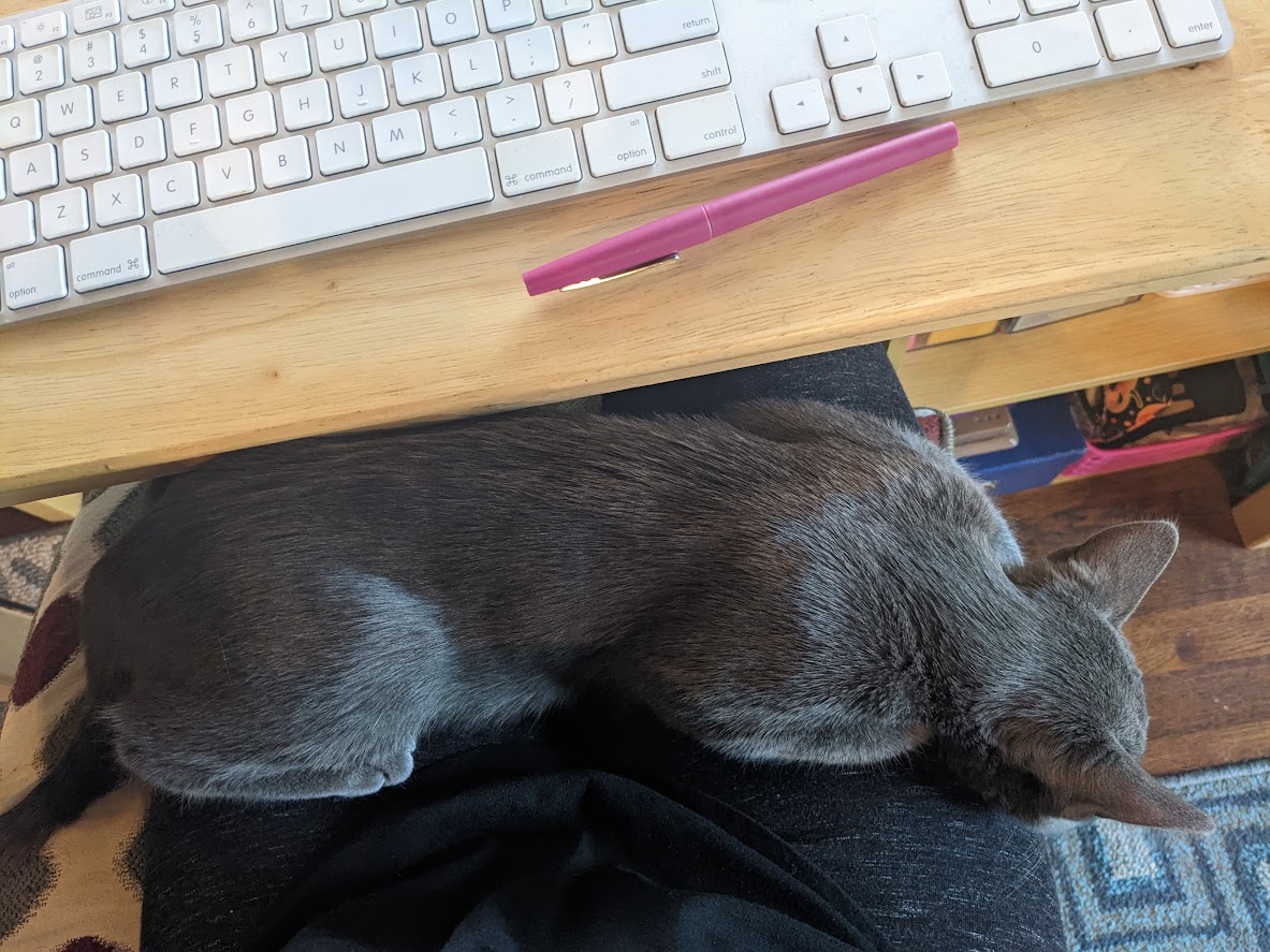 You may remember, about a six weeks ago, when I shared the news that we adopted a kitten from the litter that we fostered. At the time, Indigo was a tiny gray ball of hisses and fleas who, once he calmed down, liked to sleep on my face. Well, I’m happy to report that we cleared up the fleas (and the ringworm and upper respiratory infection we didn’t yet know he had) and he is now a sleek, soft, growing boy who never hisses anymore but still likes to sleep on my face and also sometimes enjoys biting our feet. Indie’s a mess, and we love him dearly, and he’s currently considering doing some editing to this blog post, so if the phrase “skjhdkjfhasha” appears anywhere, please ignore it.