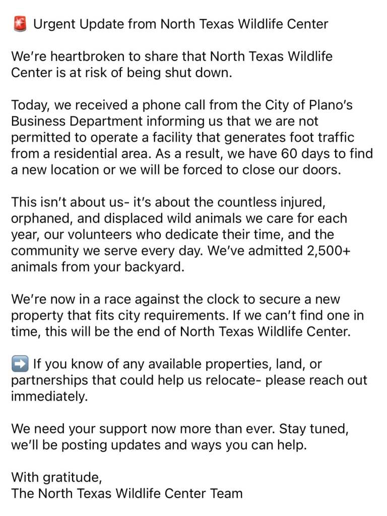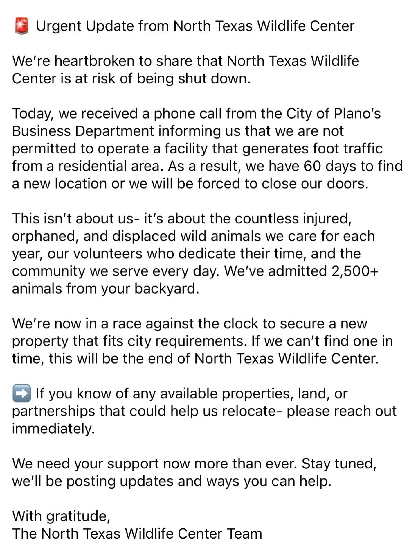 - For more information on the North Texas Wildlife Center, please visit their website or Facebook page.