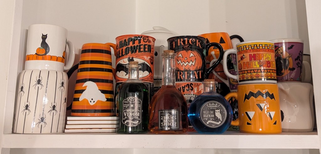 Today, I glanced up at my shelf of Halloween coffee mugs and dishes, waiting patiently for fall to arrive, and suddenly I remembered a dream I had Monday night. Apparently, my unconscious brain remembered that the following day was the first of the month—just not which month—because in the dream, I was getting a blue mug for my coffee when I gasped and said to my husband, “Today’s October first! We should be using the Halloween mugs!”